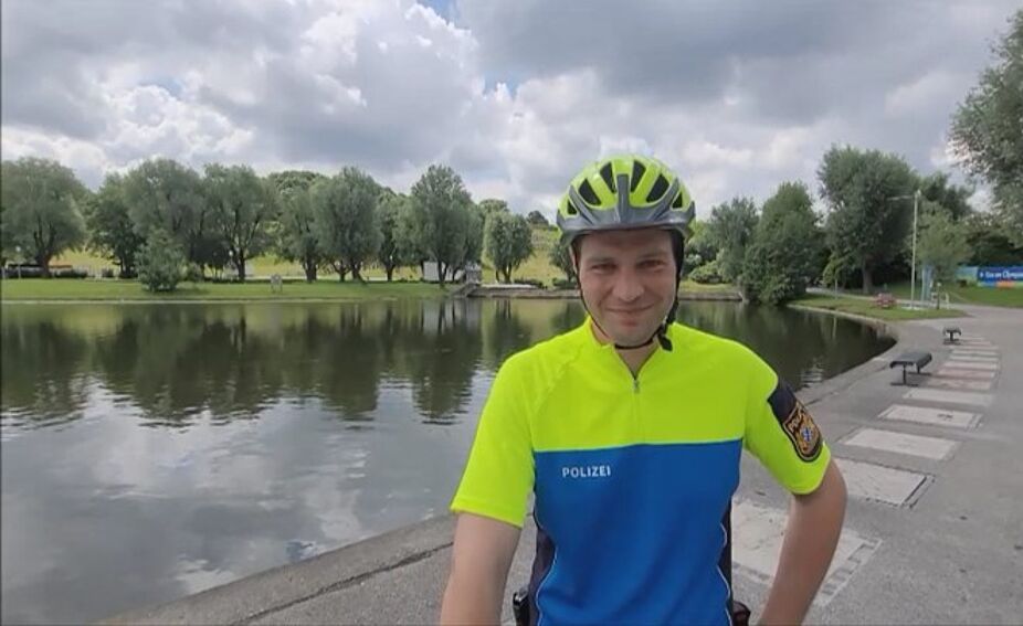 Warum Fahrradpolizist Pötsch privat (noch) nicht auf'm Radl sitzt und warum sich das demnächst ändert, das erzählt er beim Interview mit Lutz Bäucker am Olympiasee in München.