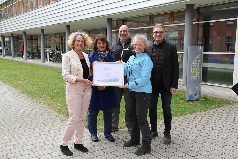 V.l.n.r.: Dr. Esther Schnetz (Kanzlerin, Hochschule Ansbach), Waltraut Kaufmann (ADFC Ansbach), Klaus Helgert (Mitglied im Landesvorstand, ADFC Bayern), Genevieve Cory (Auditorin Fahrradfreundlicher Arbeitgeber), Prof. Stefan Weiherer (Nachhaltigkeitsbeauftragter/ CSO, Hochschule Ansbach). © Hochschule Ansbach