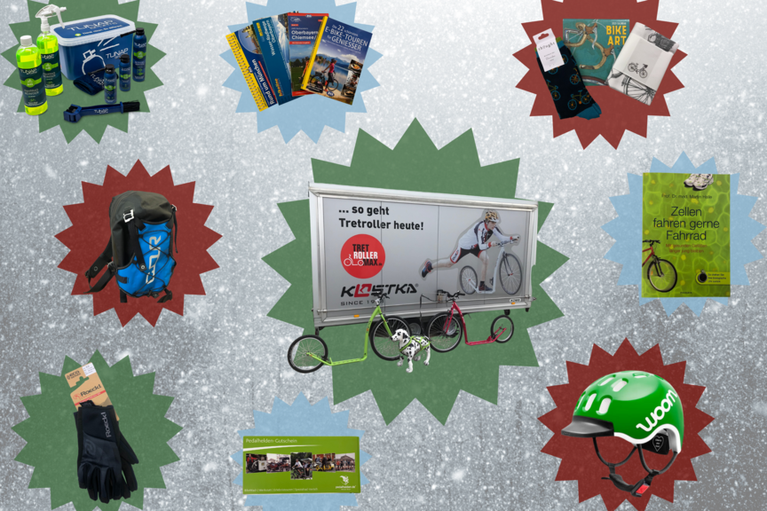Von praktischen Alltagsgegenständen fürs Radfahren wie Helm und Handschuhe über Radtourenkarten für die schönsten Regionen Bayerns bis hin zu Fahrradreinigungsprodukten ist alles mit dabei. Am 24.12. erwartet alle Radbegeisterten ein Highlight, denn dann verlosen wir einen ganz besonderen Hauptpreis: einen Tretroller von Kostka, zur Verfügung gestellt von Tretrollermax!