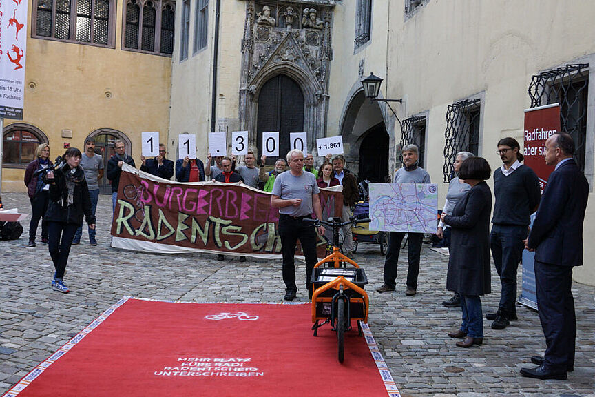 Regensburg ist nach Bamberg, München und Würzburg die vierte Stadt in Bayern, in der eine Initiative aus engagierten Bürger*innen und Organisationen, darunter auch immer der örtliche ADFC, ein Bürgerbegehren zum Radverkehr zum Erfolg geführt hat. Am 23. Oktober hatte der Radentscheid Regensburg mehr als 13.000 Unterschriften an Regensburgs Bürgermeisterin Maltz-Schwarzfischer übergeben. Die 11.300 von Regensburger Wahlberechtigten waren fast doppelt so viele als die 6.000 für ein erfolgreiches Bürgerbegehren notwendigen. Dazu kamen 1.861 unterstützende Unterschriften, meist von Bürger*innen aus dem Landkreis. Am 21. November dann hat der Stadtrat die Forderung des Bürgerbegehrens „Radentscheid Regensburg“ mit großer Mehrheit übernommen.