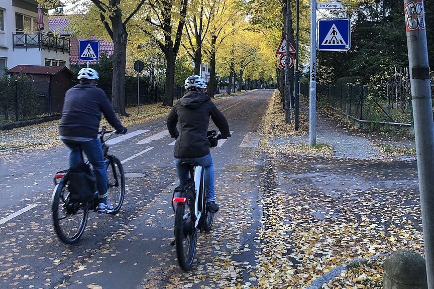 Auf nassem, verschmutztem Untergrund besteht erhöhte Rutschgefahr. Vorausschauendes Fahren ist gefragt! Für Radfahrende bedeutet das: einen großzügigen Abstand zu vorausfahrenden Personen halten, das Tempo reduzieren und Vollbremsungen vermeiden. Pedelecfahrende sollten auch das höhere Gewicht und die schnellere Beschleunigung ihres Rades bedenken. Bei Glätte und fester Schneedecke gilt, vor der Kurve zu bremsen und in der Kurve zu rollen. Generell sollten Radfahrer*innen nicht zu enge Kurven fahren und abrupte Schlenker vermeiden.